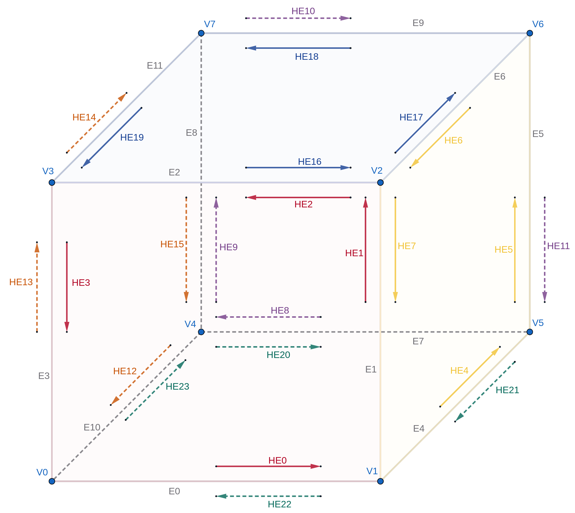 In some implementations, these optional values can even be derived implicitly through simple index arithmetic. Others also include a pointer to the previous halfedge, though this isn’t strictly necessary, since it can be found by walking the face in order.